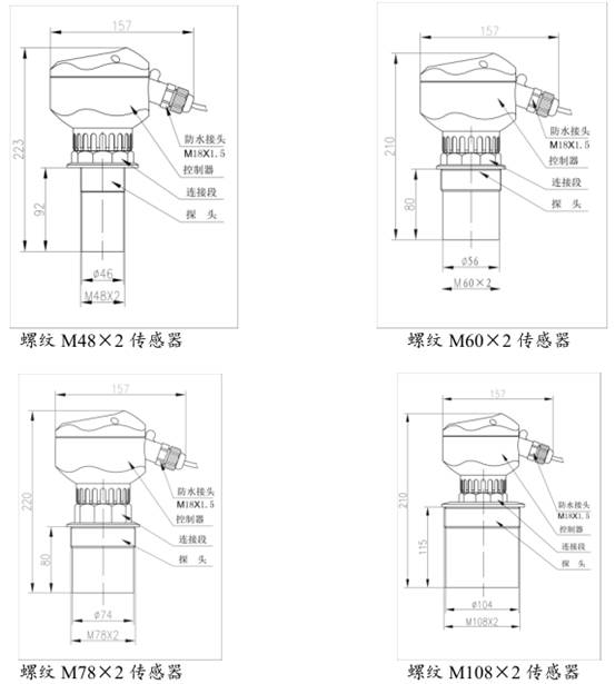 SKCYW系列超聲波液位計 ; SKCYW系列超聲波液位計是由微處理器控制的數(shù)字液位儀表。在測量中脈沖超聲波由傳感器發(fā)出,聲波經(jīng)液體表面反射后被同一傳感器接收并轉(zhuǎn)換成電信號。超聲波液位計具有自動功率調(diào)整,溫度補償,抗干擾等功能。由于采用非接觸測量,被測介質(zhì)幾乎不受控制,可廣泛應用于水環(huán)境、酸堿、泥漿、食品等多種環(huán)境。 1、測量流量、液位、低表壓、真空和比重 2、兩線制最大量程可達30m 3、四線制最大量程可達40m 4、最小分辨率1mm 5、LCD/LED大顯示屏 6、智能信號處理技術(shù) 7、配有高低位雙繼電器(僅四線制) 8、全塑料防腐外殼(防護等級lP67) 9、換能器結(jié)構(gòu)(小量程物位計法蘭安裝時,對法蘭接管長度無要求) 10、簡單的按鍵設定參數(shù)(無需等待容器排空或加滿,無需附加的遙控器) 11、靈活的安裝方式(螺紋/法蘭、固定孔/支架) 螺紋尺寸:M48*2 M60*2 超聲波液位計技術(shù)參數(shù)