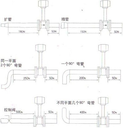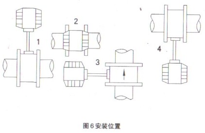 安裝條件:渦街流量計應遠離振動源,有振動時在前后直管段2DN處加支架用橡皮減振。傳感器通徑圓應與直管段內(nèi)徑圓保持同心。法蘭焊接時,密封夾緊時,管內(nèi)不得有突出部分。流向應與箭頭方向一致。(高溫時推薦2、3、4位置,常溫和低溫時推薦1位置,垂直管道時選3位置)見圖6