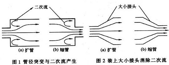 無論是變大還是變小,都會產生二次流動,干擾正常的流速分布。通常在遇到這類情況的時候,我們會為管道安裝合適的大小接頭,如圖2所示。為流體做合理過渡,使流速能夠恢復到正常狀態,保證測量數據的準確與穩定。