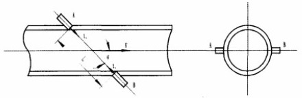 在管道中斜裝一對超聲波傳感器兩個傳感器之間的距離L為超聲波傳播聲程。那么,超標在兩各傳感器之間的順流和逆流傳播時間分別為: