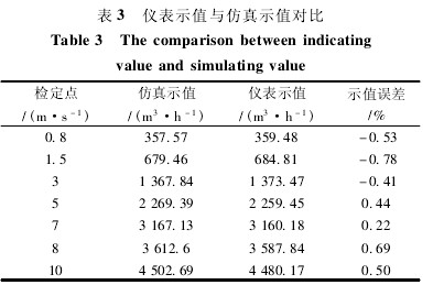 為了驗(yàn)證通過上述方法所得到的插入式電磁流量計(jì)等效信號(hào)作用范圍的可靠性,把該尺寸的傳感器探頭形狀加工制作成流量計(jì)樣機(jī)在口徑為 400mm 的管道上進(jìn)行流量測(cè)量,插入深度也保持在 120mm。其測(cè)量得到的體積流量與仿真得到的流量進(jìn)行對(duì)比,如表 3 所示,其中計(jì)算仿真流量示值所用的流速是上述得到的等效信號(hào)作用范圍內(nèi)的平均流速ū。